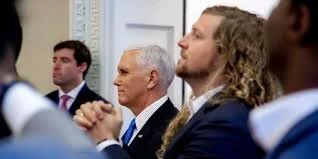 Sean Feucht (foreground of Mike Pence) with pastors and worship leaders praying for President Trump at Whitehouse